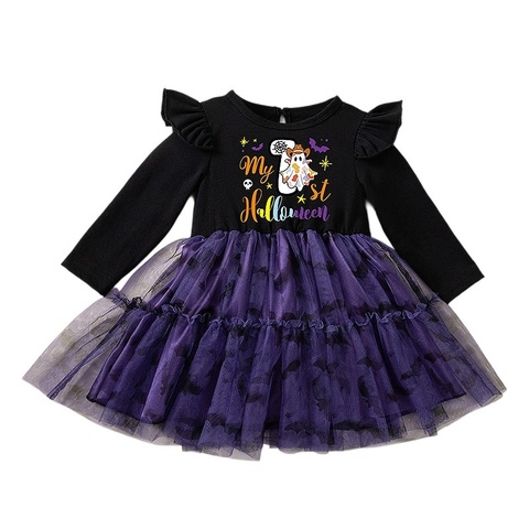 2025 sonbahar cadılar bayramı kız elbise yeni çocuk rahat tek parça o-boyun yaka uzun kollu karikatür dantel örgü etek
