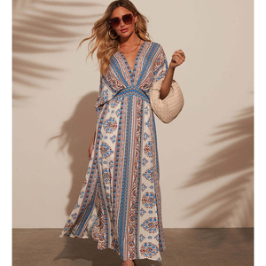 2025 फैशन नया फ्रंट स्लिट ड्रेस आकस्मिक पैस्ली प्रिंट ड्रेस v-गर्दन कमर की कमर