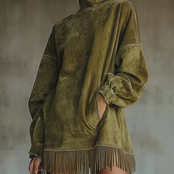 2025 New Arrival High-Neck Suede Velvet Vintage Oversized Pocket Fringe Long-Sleeve Dress