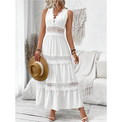 Summer Women's Vintage Lace Patchwork V-Neck Sleeveless Dress High Quality Lace Long Dress White 2025